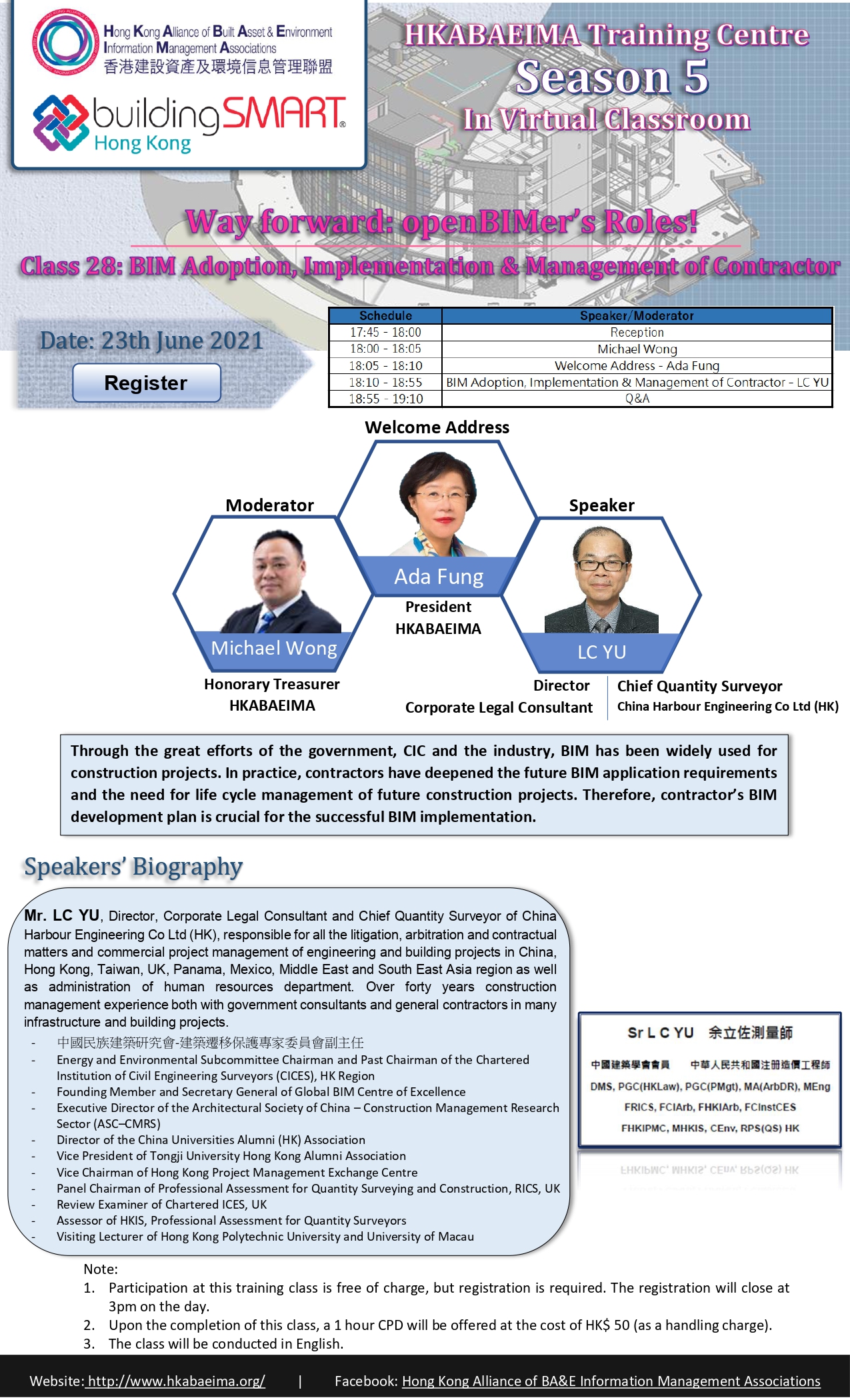 HKABAEIMA Training Centre Training Class Season 5: Way forward – openBIMer’s Roles BIM Adoption, Implementation & Management of Contractor