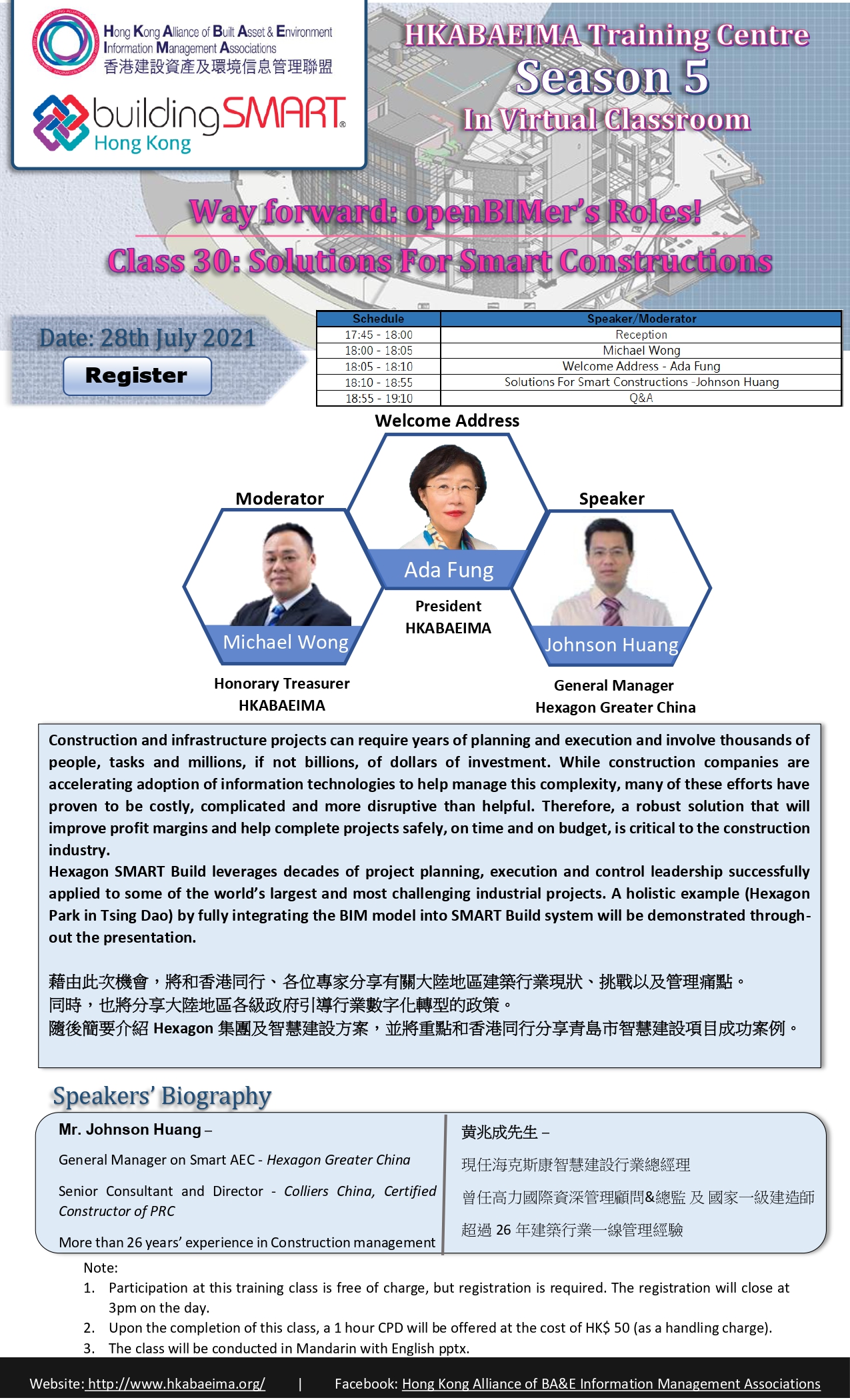 August 11, 2021The Hong Kong Alliance of Built Asset & Environment Information Management Associations (HKABAEIMA) will hold the training class (Solutions for Smart Constructions) in virtual meeting room on 28th July, 2021 (Wednesday). Our Institute (HKICBIM) as one of HKABAEIMA’s founding members, we are honored to invite all HKICBIM members to join the series of training classes on different topics to strengthen the understanding of transiting from BIM to openBIM.