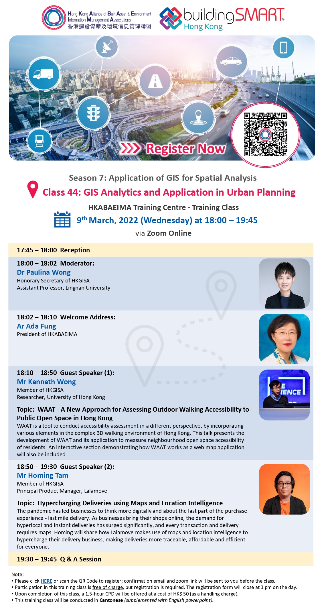 March 23, 2022The Hong Kong Alliance of Built Asset & Environment Information Management Associations (HKABAEIMA) will hold the training class (GIS Analytics and Application in Urban Planning) in virtual meeting room on 09th Mar, 2022 (Wednesday). Our Institute (HKICBIM) as one of HKABAEIMA’s founding members, we are honored to invite all HKICBIM members to join the series of training classes on different topics to strengthen the understanding of transiting from BIM to openBIM.