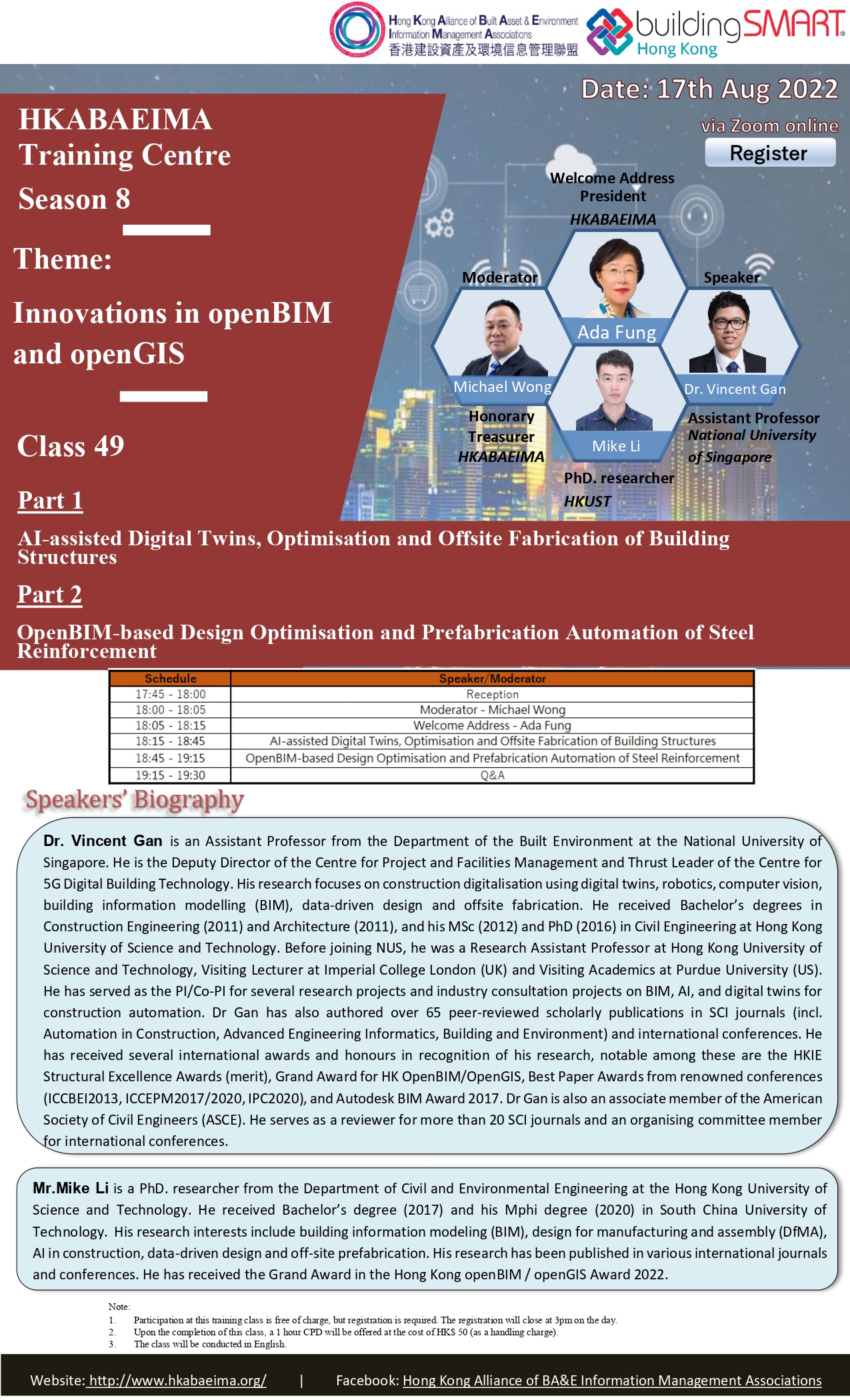 HKABAEIMA Training Centre Training Class Part 1 – AI-assisted Digital Twins, Optimisation and Offsite Fabrication of Building Structures Part 2 – OpenBIM-based Design Optimisation and Prefabrication Automation of Steel Reinforcement