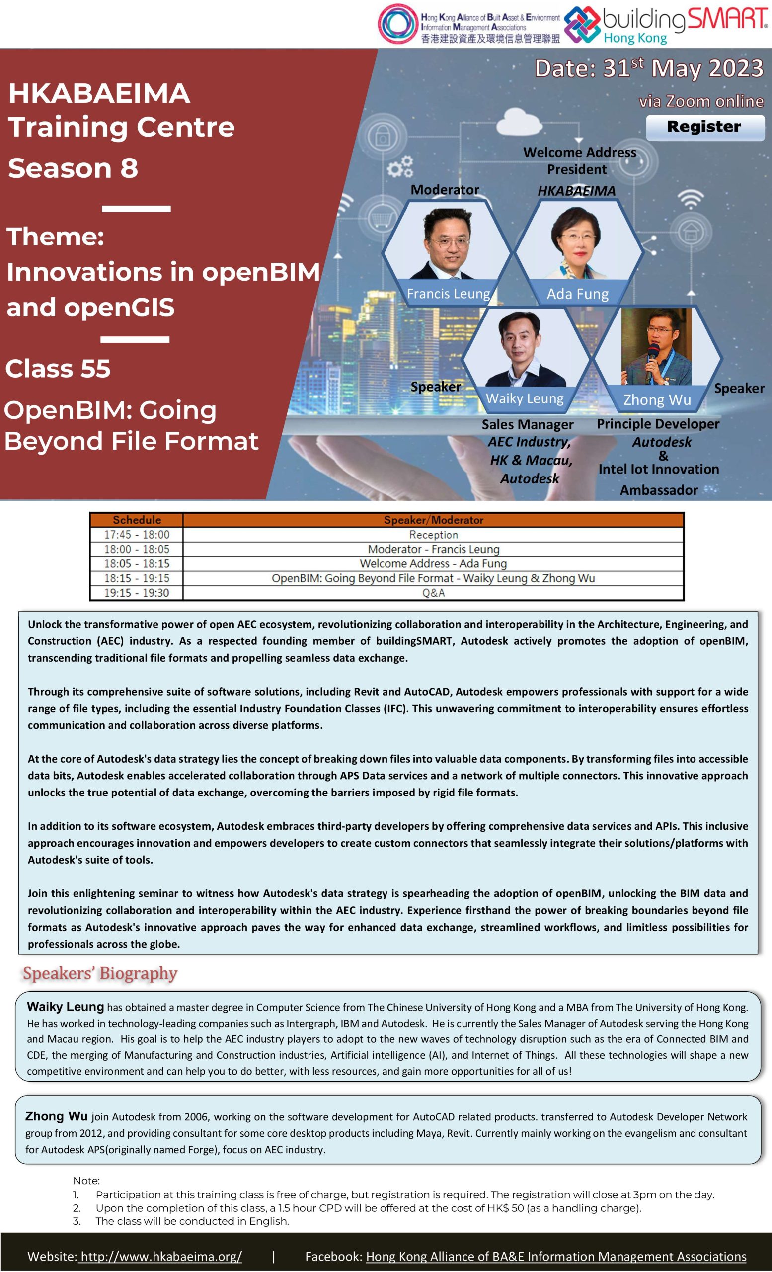The Hong Kong Alliance of Built Asset & Environment Information Management Associations (HKABAEIMA) will hold the training class (OpenBIM: Going Beyond File Format) in virtual meeting room on 31st May, 2023 (Wednesday). Our Institute (HKICBIM) as one of HKABAEIMA’s founding members, we are honored to invite all HKICBIM members to join the series of training classes on different topics to strengthen the understanding of innovations in openBIM and openGIS.