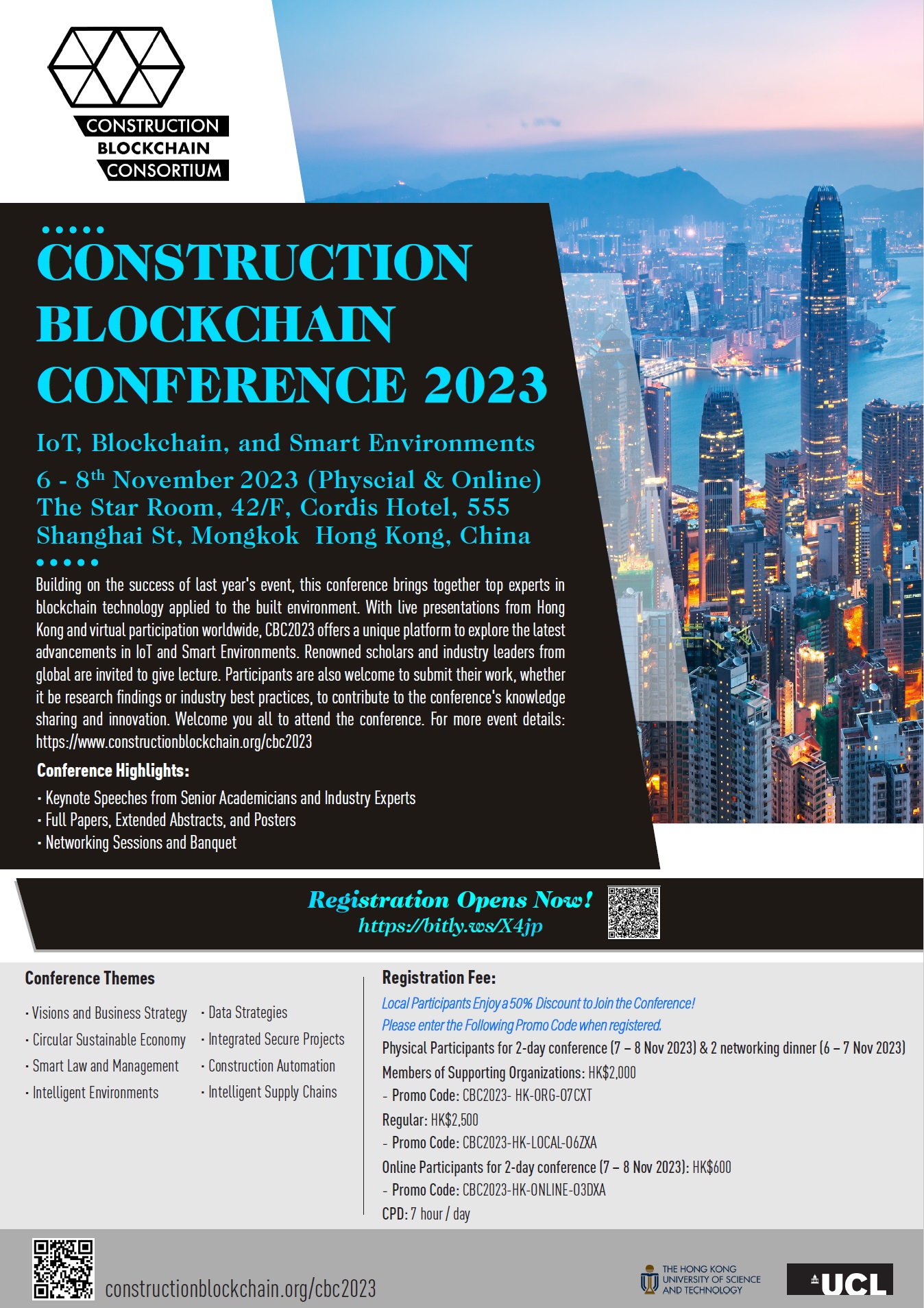 For registration, please go to https://www.eventbrite.co.uk/e/cbc-2023-construction-blockchain-iot-and-smart-environments-tickets-635461792327. There are different corresponding codes for local participants to enjoy discounts.